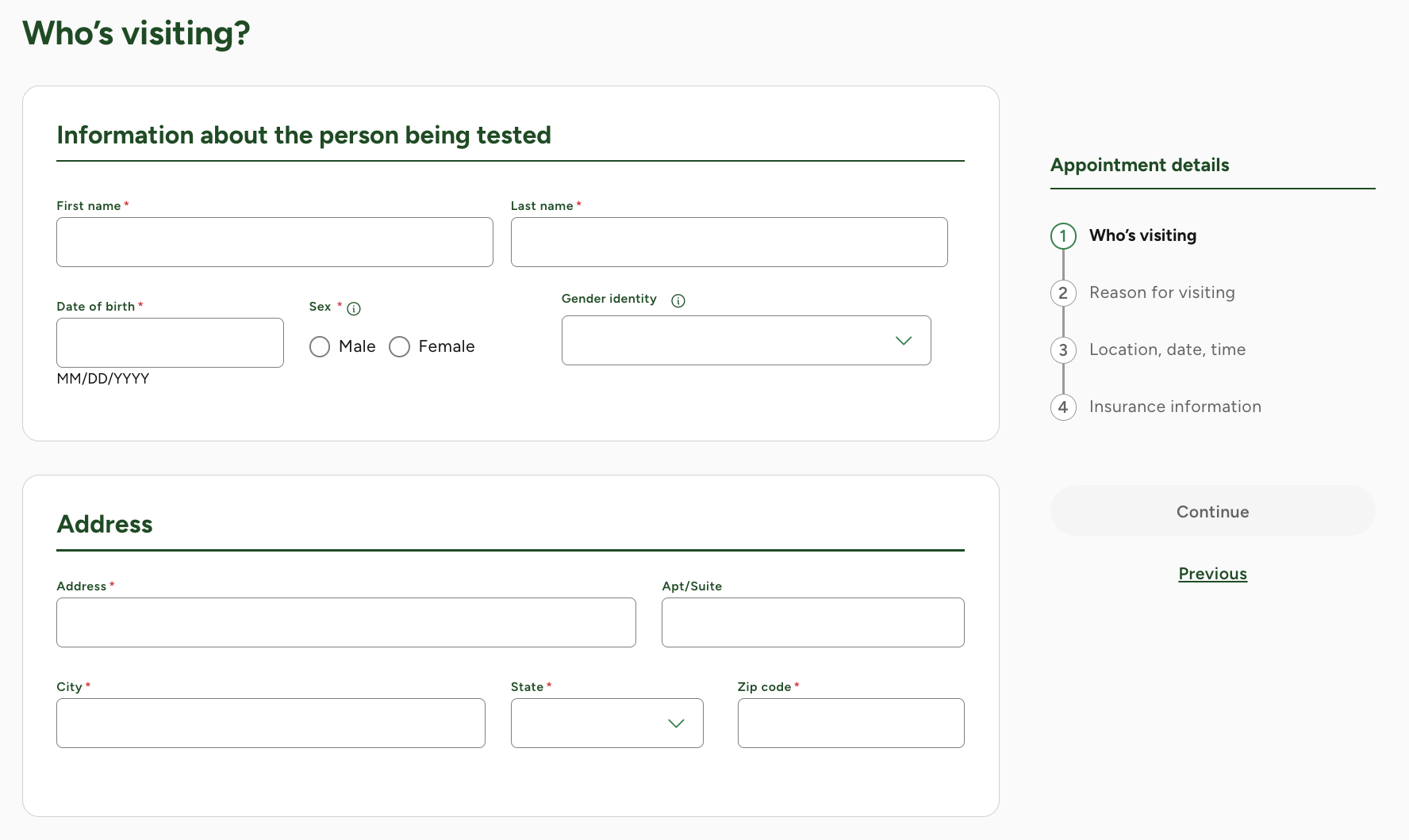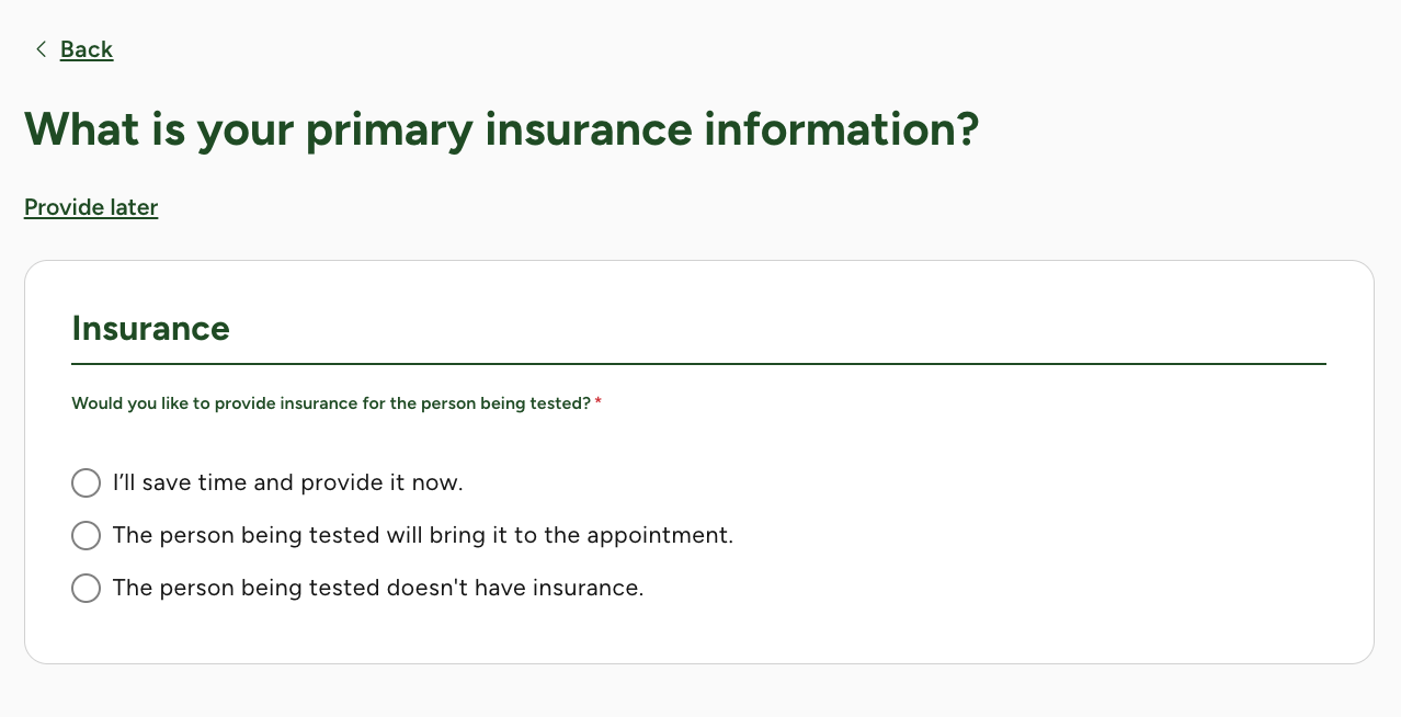 Quest will ask you for your insurance information, but you can skip this step and choose "the person being tested doesn't have insurance". You will NOT need to pay the lab or use insurance for this visit.